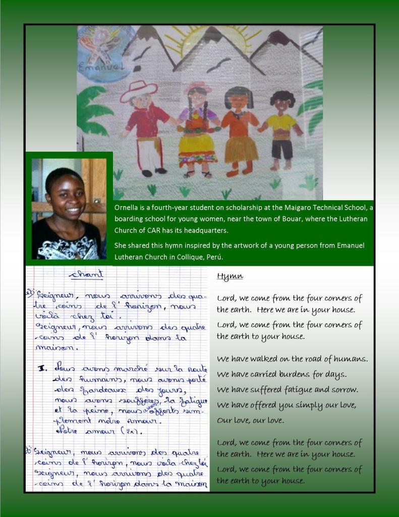 Connecting the hands and hearts of the youth from the Lutheran Churches of the Central African Republic and Peru. Artwork created by a youth of Emanuel Lutheran Church in Collique, Perú, inspired Ornella, one of the young women on scholarship at the Maigaro Technical High School in CAR, to share a song. Let’s join voices with Ornella and sing to our God!