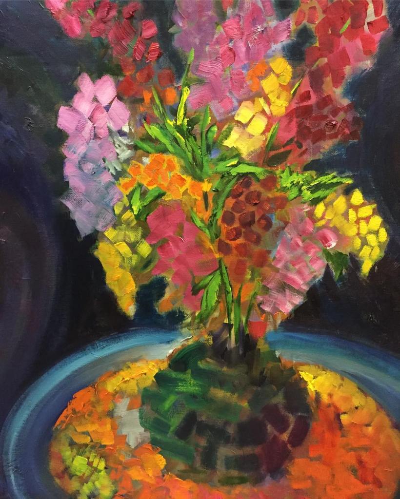 Extra! Extra! … A bonus 16×20 made with the excess paint from my last dozen or so paintings. While I like painting with just one brush, a practice I learned during the online class I took, it did involve a lot of brush cleaning onto paper towels between colors, which I didn’t like. I decided to put the extra paint on a canvas.
