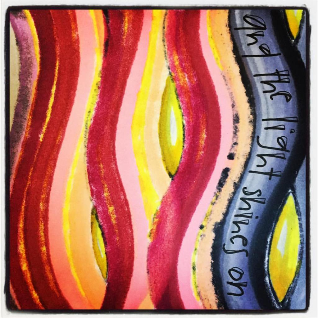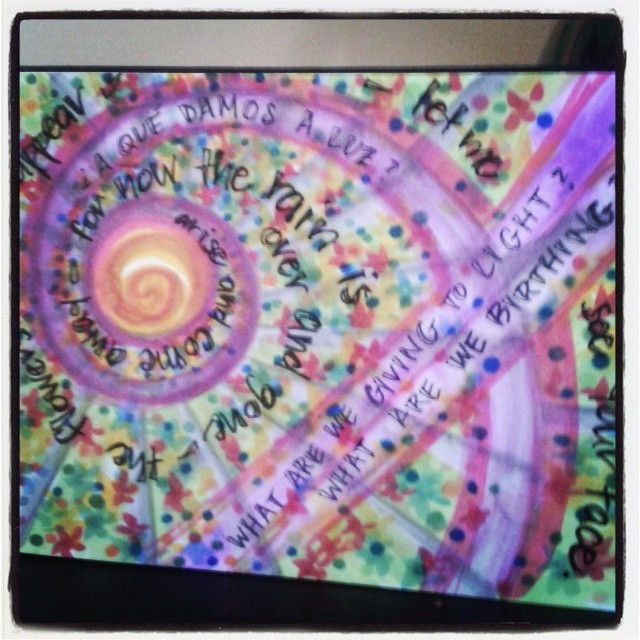 Do you see the three loops starting at the upper left spiraling down? That’s my representation of Trinity, ever flowing in, with and through everything, including us. Notice the direction of the path of transformation is a descent. Notice the individual rays of the sun. As I was adding and adjusting them one to another, I was also taking into account how the whole was affected.
