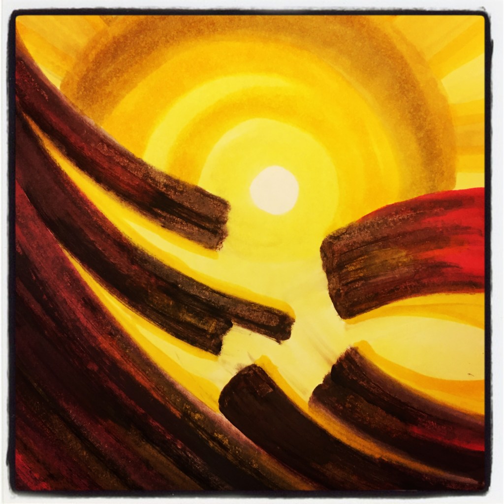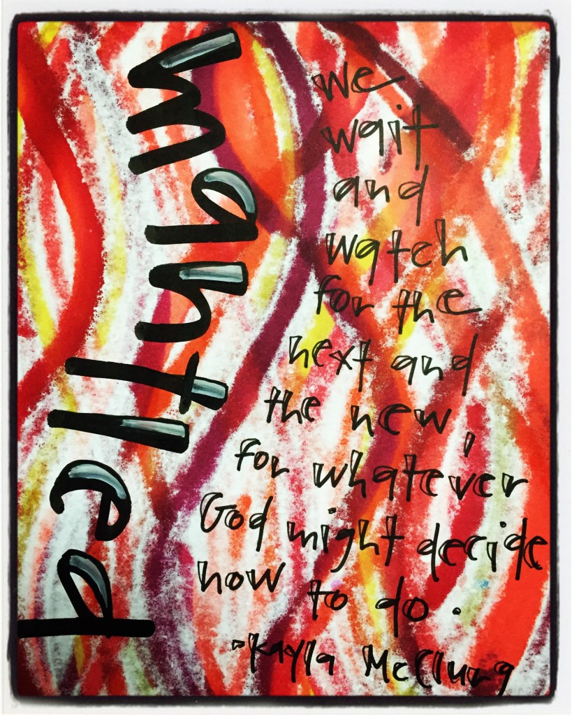Sometimes my journaling happens away from my usual desk location. Such was the case with the image in 2016. It came to be in a hotel bathroom the day after Jim and I were installed as Grunewald Guild co-directors in 2016. During the ceremony we were “mantled” with a red scarf woven by Guild Co-Founder Liz Caemmerer.