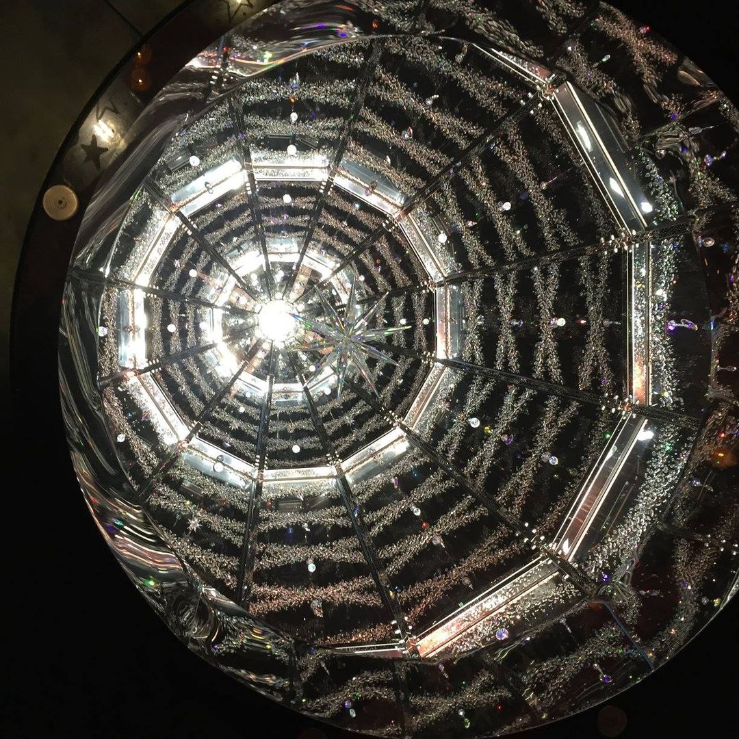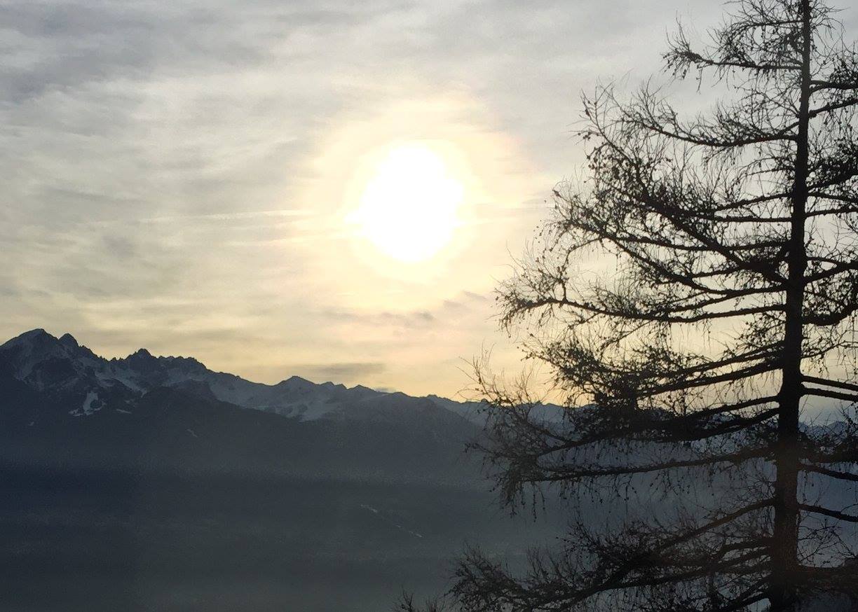 Below I share a couple photos from my time in Austria. One is a vista while riding in a car; the other is a look up into a tower at the Christmas Market in Innsbruck. It intrigues me that a year later I take a very similar vista photo from the River House porch at the Grünewald Guild.