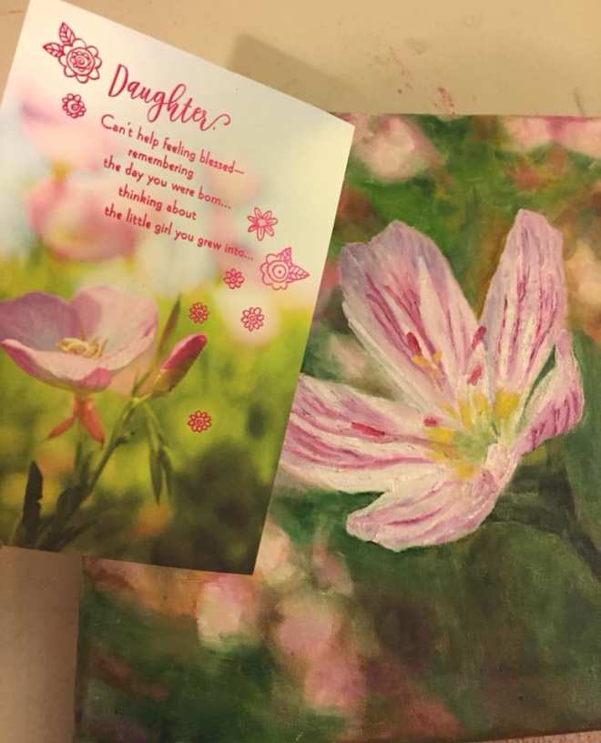 Written on January 4, 2020: “How intuitive is a mother’s love?! Check out my current painting compared to the card I just received from my mom… crazy and wonderful.”