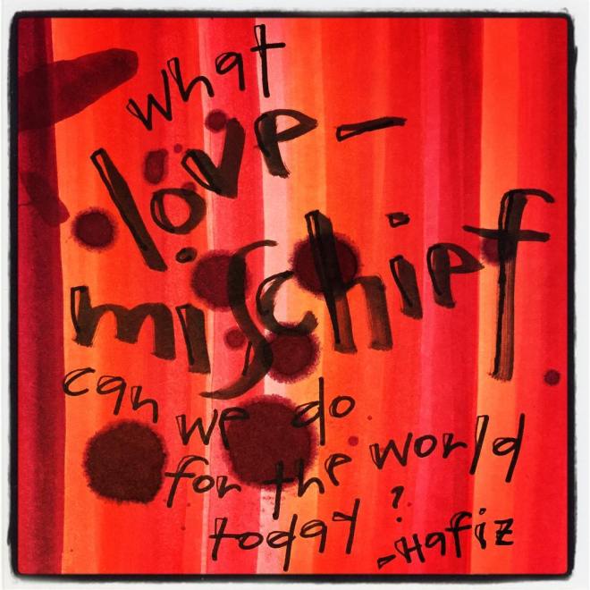It used to be / That when I would wake in the morning / I could with confidence say, “What am ‘I’ going to do?” / That was before the seed cracked open. / Now Hafiz is certain: / There are two of us housed in this body / Doing the shopping together in the market and / Tickling each other while fixing the evening’s food. / Now when I awake all the internal instruments / Play the same music: / “God, what love-mischief can we do for the world today?” —Hafiz, “The Gift”
