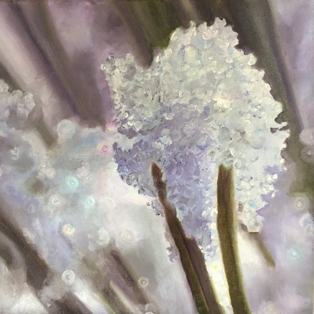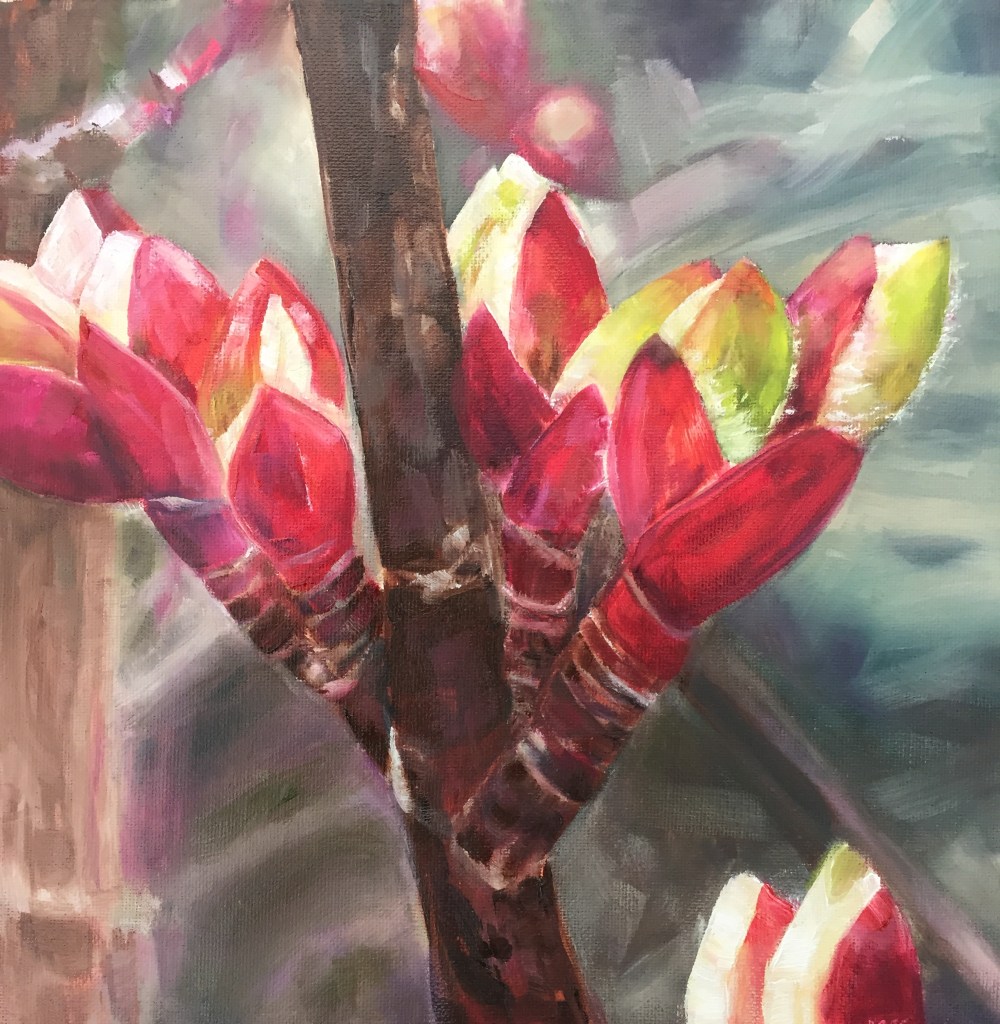 These 12×12 inch oils on canvas tell stories of seasons and generations of plant life, found mostly around the Grünewald Guild in Washington State, where my husband and I served as directors. Most of the paintings remain on the Guild campus.
